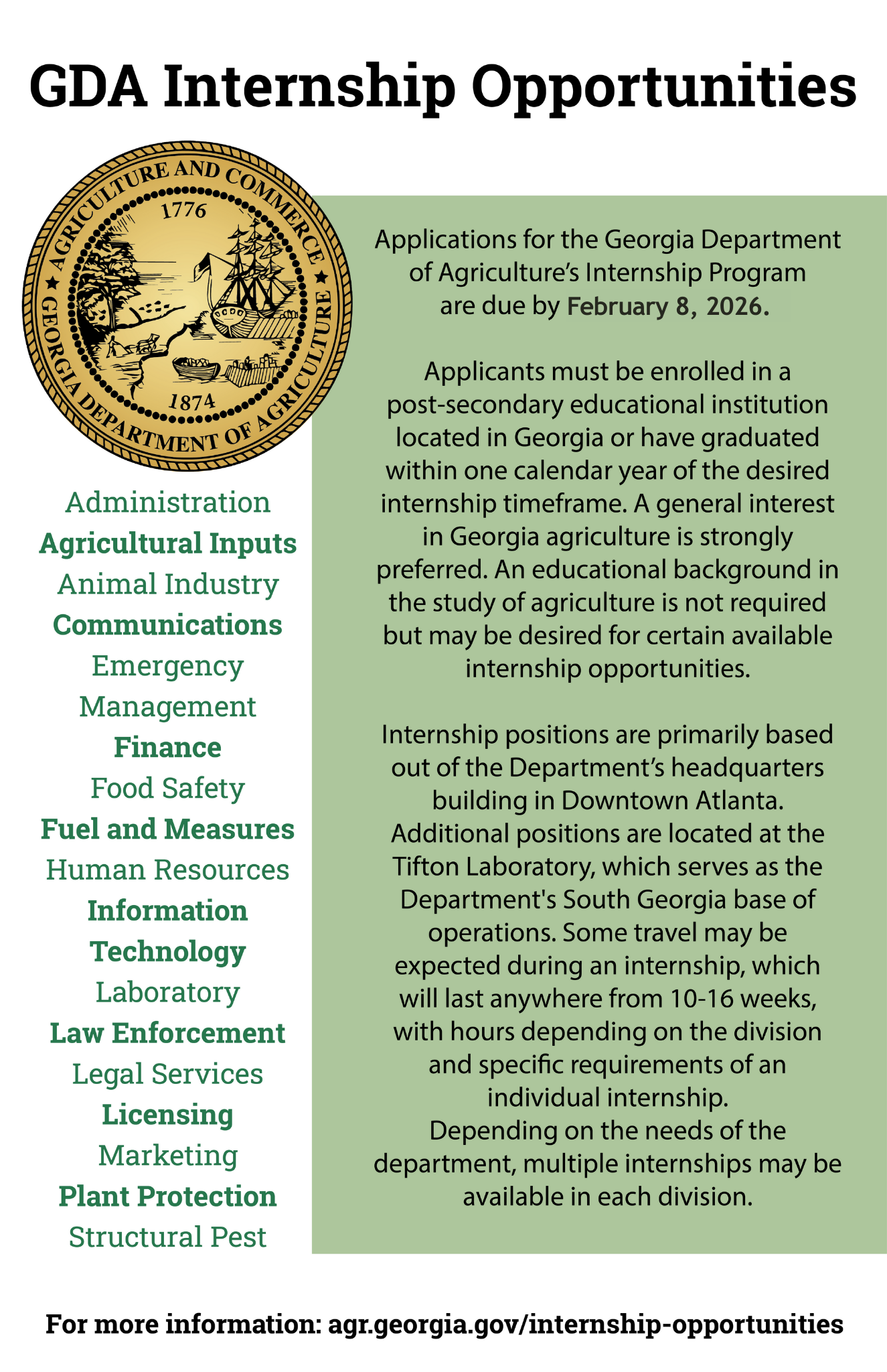 The Georgia Department of Agriculture has hosted dozens of interns in various sections within the Department’s oversight. These students come from several Georgia universities and colleges, studying majors both directly and indirectly related to agriculture. The Department looks forward to expanding and promoting its internship program. Students who are interested in a possible internship opportunity with the Department can learn more from our Internship FAQ.